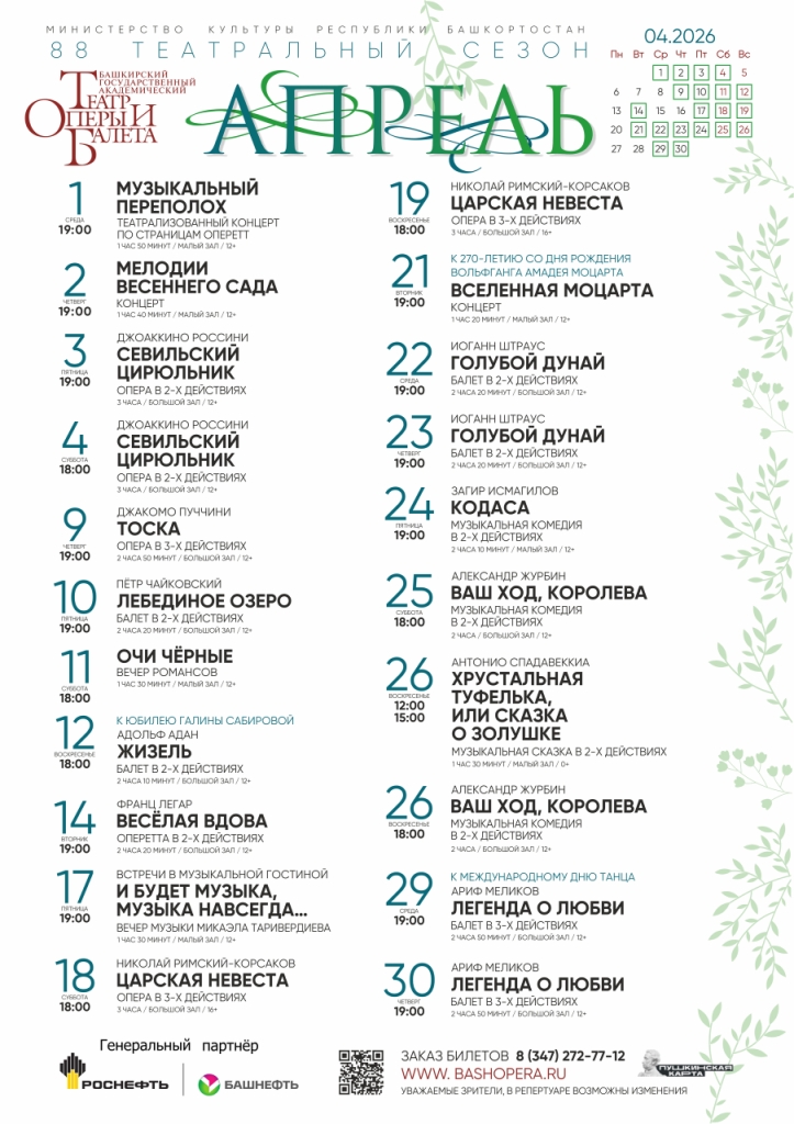 Репертуарный план Башкирского государственного академического театра оперы и балета на апрель 2026 г.