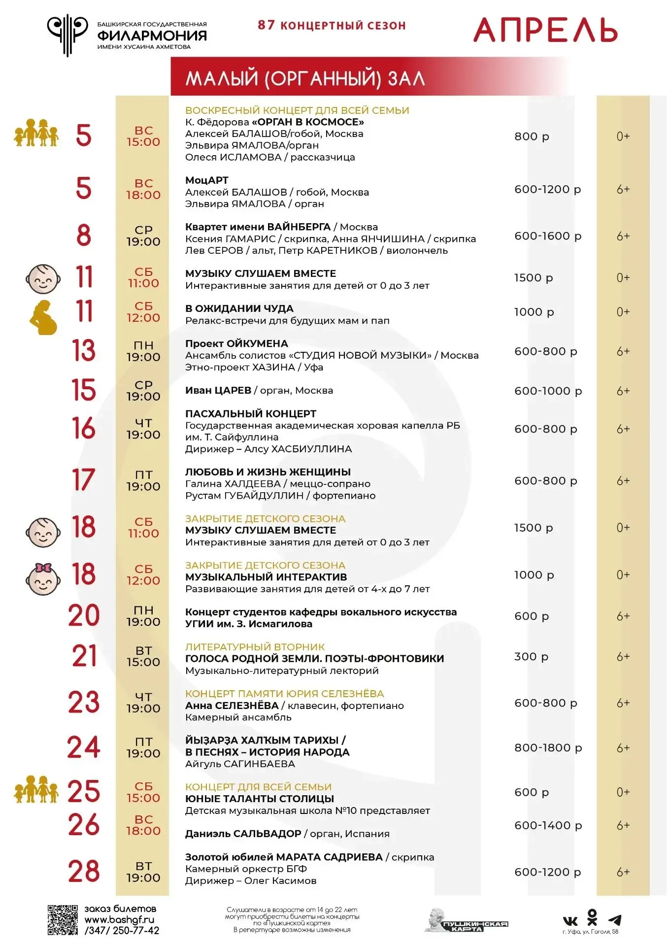 Репертуарный план Башкирской государственной филармонии им. Х. Ахметова (Большой зал) на апрель 2026 г.