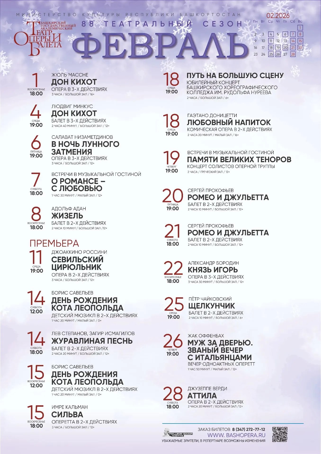 Репертуарный план Башкирского государственного академического театра оперы и балета на февраль 2026 г.