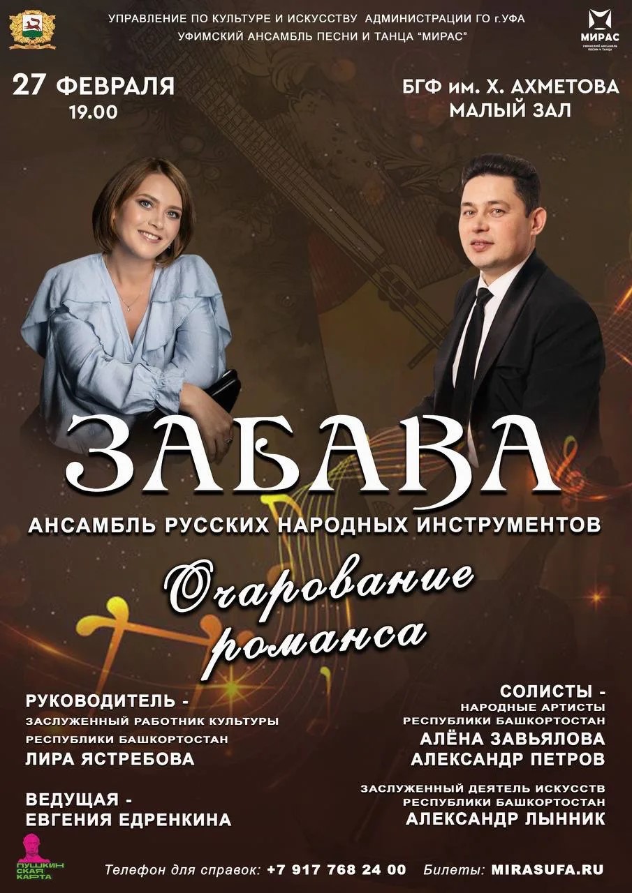 27 февраля 2026 года в Малом зале Башкирской государственной филармонии имени Хусаина Ахметова Ансамбль русских народных инструментов «Забава» представит программу «Очарование романса». В этот вечер со сцены прозвучат как классические, так и цыганские романсы.