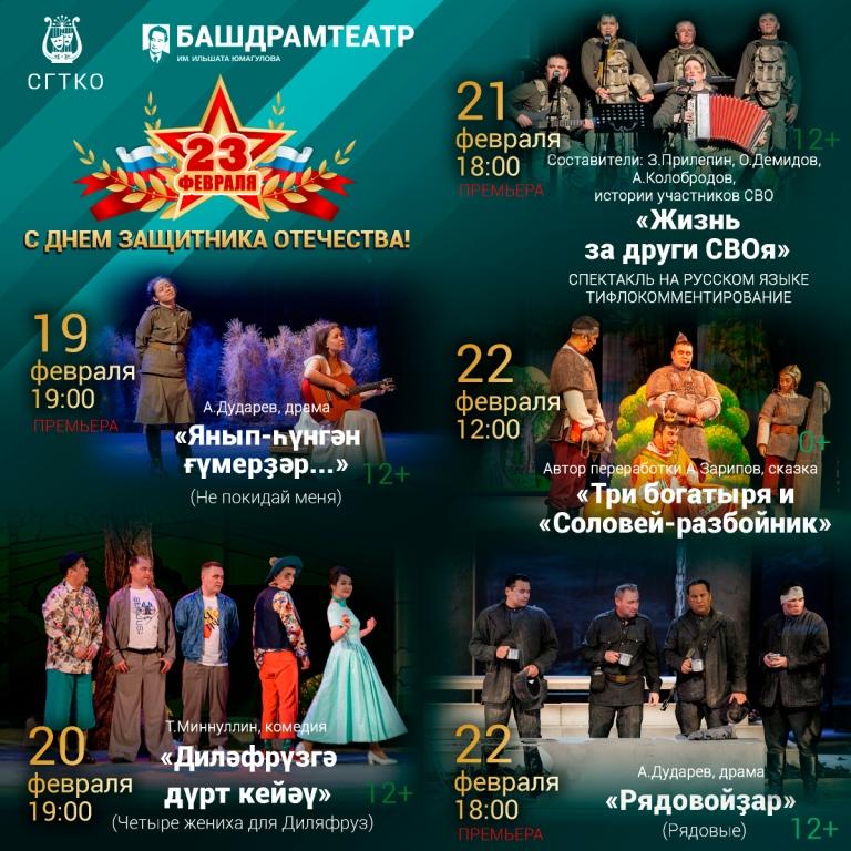 С 19 по 22 февраля Башкирский драматический театр имени Ильшата Юмагулова Стерлитамакского государственного театрально-концертного объединения приглашает на праздничные мероприятия, приуроченные ко Дню защитника Отечества.