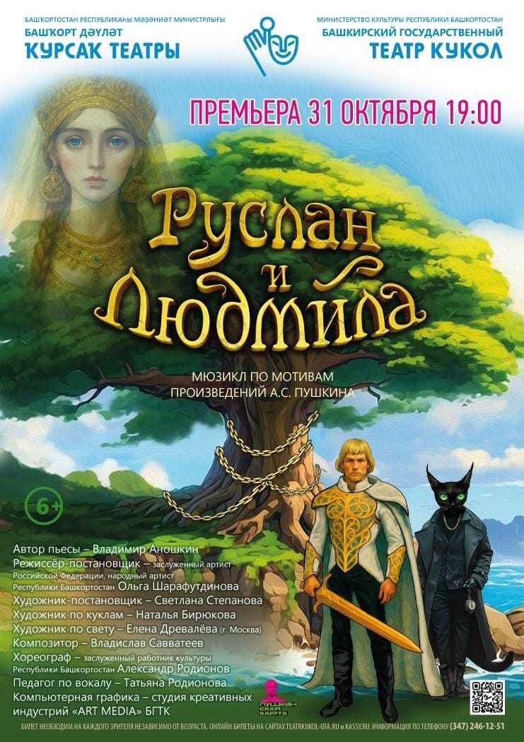 31 октября и 1 ноября в Башкирском государственном театре кукол состоится премьера мюзикла «Руслан и Людмила» по мотивам произведений Александра Сергеевича Пушкина. Режиссёр-постановщик – заслуженная артистка Российской Федерации, народная артистка Республики Башкортостан, главный режиссёр Башкирского государственного театра кукол Ольга Шарафутдинова.