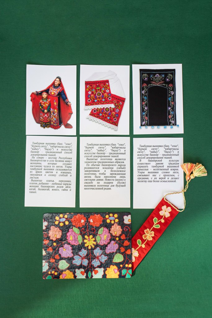 - три яркие открытки, рассказывающие об истории тамбурной вышивки и ее применении в украшении традиционных предметов одежды и быта;