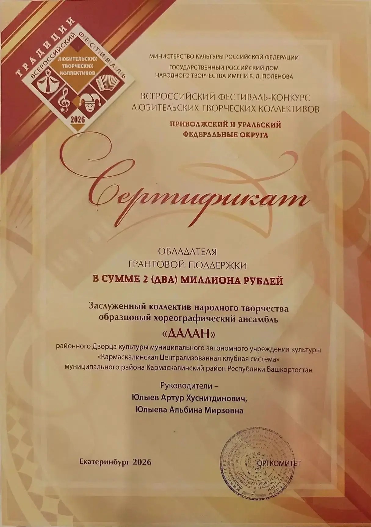 Заслуженный коллектив народного творчества Российской Федерации и Республики Башкортостан Образцовый хореографический ансамбль «Далан» из Кармаскалинского района - победитель Всероссийского фестиваля-конкурса любительских творческих коллективов в номинации «Традиции». Ансамбль удостоен почетного звания лауреата фестиваля и стал обладателем гранта в размере 2 миллионов рублей. Руководители – заслуженные работники культуры Республики Башкортостан Артур и Альбина Юлыевы.️