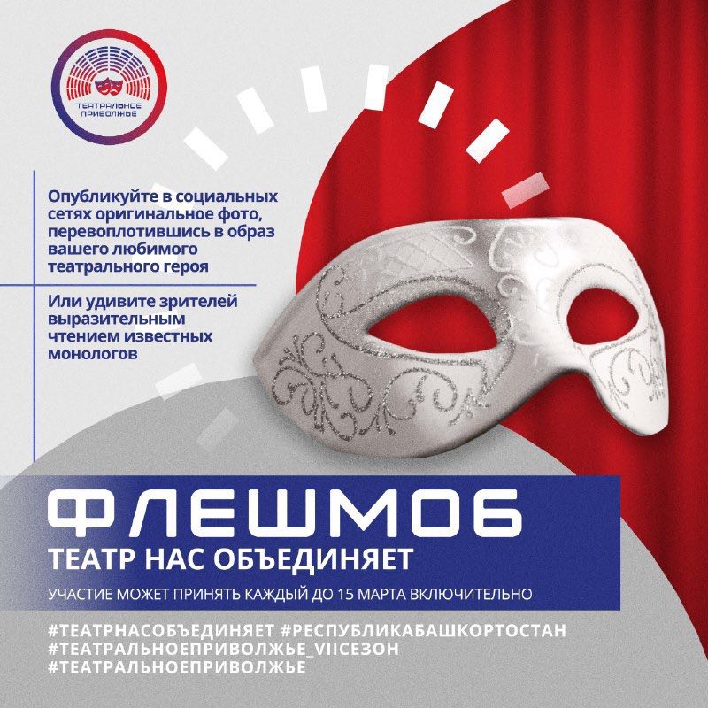 Чтобы присоединиться к флешмобу, необходимо опубликовать свой творческий контент в социальных сетях с использованием хэштегов #Театрнасобъединяет, #РеспубликаБашкортостан, #театральноеприволжье_VIIсезон и #ТеатральноеПриволжье.