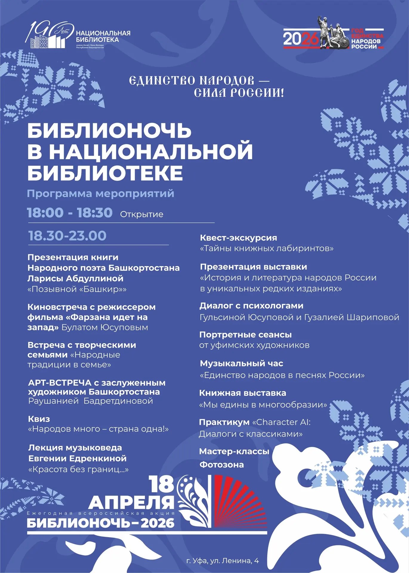 18 апреля в Национальной библиотеке Республики Башкортостан и её филиалах гостей ждут увлекательные квесты, познавательные мастер‑классы, содержательные лекции и вдохновляющие творческие встречи. Можно будет посетить презентации книг, познакомиться с уникальными изданиями на специальных выставках и сделать удивительные открытия. Всё это пройдёт под девизом «Единство народов — сила России» в рамках Года единства народов России.