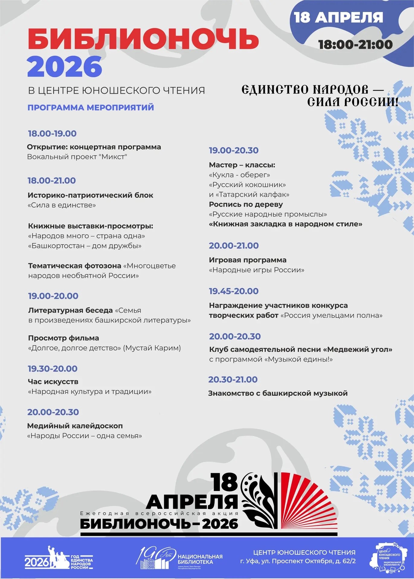 Вот уже в 15-й раз подряд в стране пройдет полюбившаяся всеми Всероссийская акция «Библионочь». В 2026 году её основная тема — «Единство народов — сила России!», поэтому на мероприятиях расскажут про разнообразие культур, традиций, языков и историю страны. В столице Республики Башкортостан — городе Уфе в этом году, помимо библиотек, к акции присоединились Союз писателей РБ и книжный магазин «Китап».
