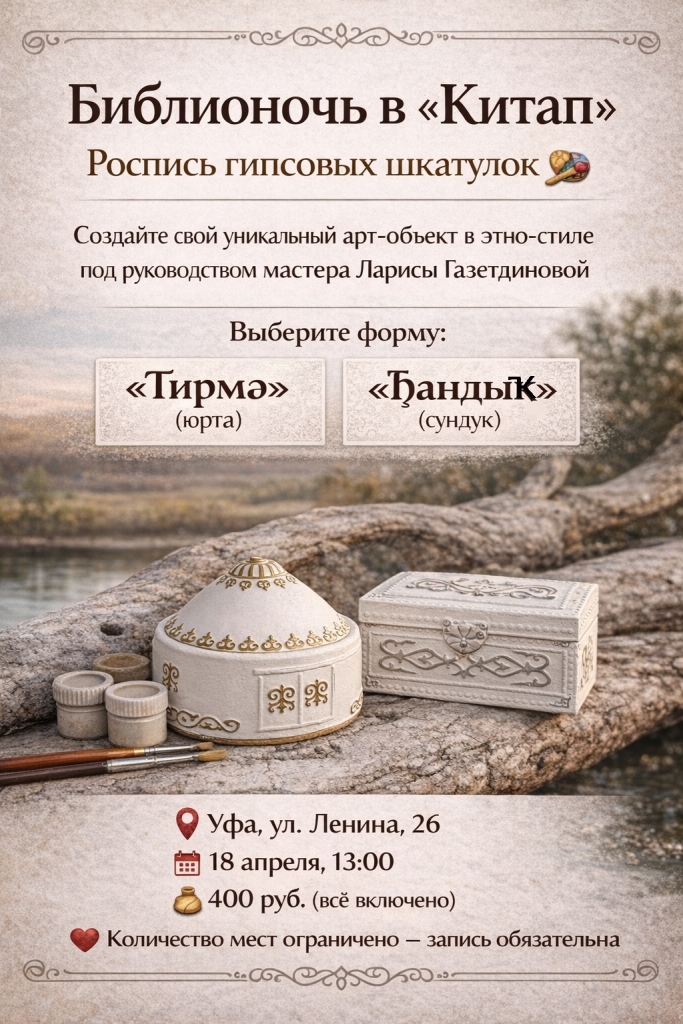 18 апреля в книжном магазине «Китап» запланирован мастер-класс от мастера Ларисы Газетдиновой по росписи гипсовых шкатулок в этно-стиле. Участники смогут выбрать один из двух орнаментальных мотивов: «Тирмә» (юрта — символ тепла и единения с природой) и «Һандыҡ» (сундук — древний узор, хранящий память рода). Такая шкатулка, пропитанная башкирской культурой, станет украшением интерьера или душевным подарком. Адрес: Уфа, ул. Ленина 26. Начало в 13:00. Стоимость: 400 рублей (материалы входят). Обязательна предварительная запись по номеру: +7 (917) 480-02-90.