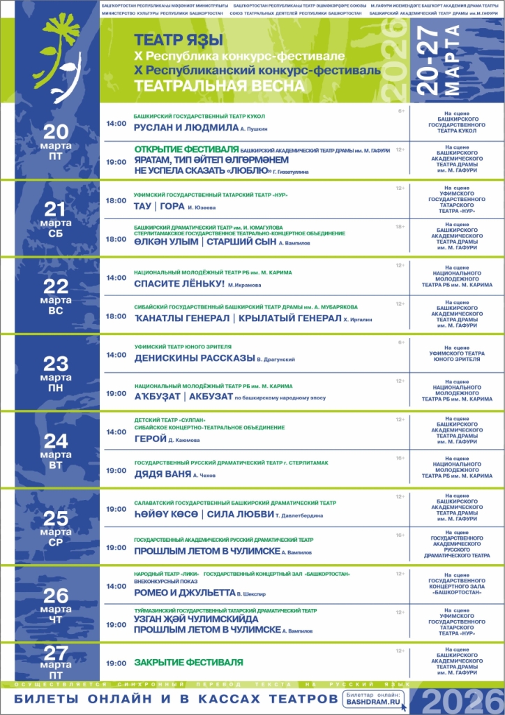 Торжественное открытие фестиваля пройдет 20 марта в Башкирском государственном театре кукол, а имена лауреатов назовут 27 марта, в Международный день театра, в Башкирском государственном академическом театре драмы им. М. Гафури.