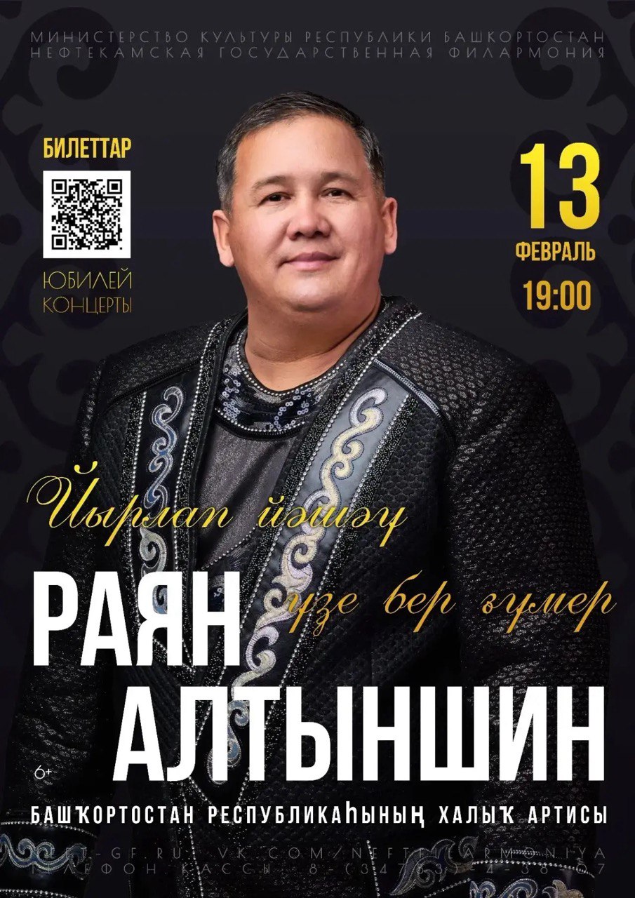 17 февраля на сцене Нефтекамской государственной филармонии состоится юбилейный концерт народного артиста Республики Башкортостан Раяна Алтыншина «Йырлап йәшәү – үҙе бер ғүмер» («Жить с песней длиною жизнь»).