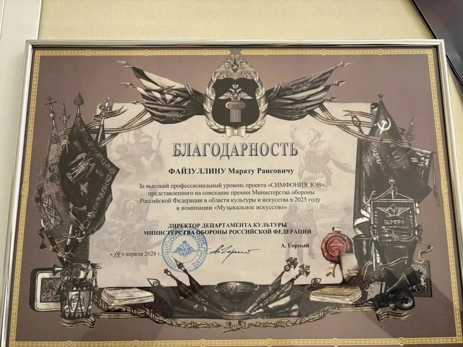 Примечательно, что Марат Файзуллин является композитором ещё одного проекта, отмеченного 14 апреля Благодарностью Министерства обороны, — документального спектакля «Народная история. Непокорённый Курск».Завершая церемонию, Артём Горный поблагодарил деятелей искусства за их беззаветное служение отечественной культуре и вклад в общую победу, отметив, что путь созидания является абсолютно необходимым в текущих условиях.