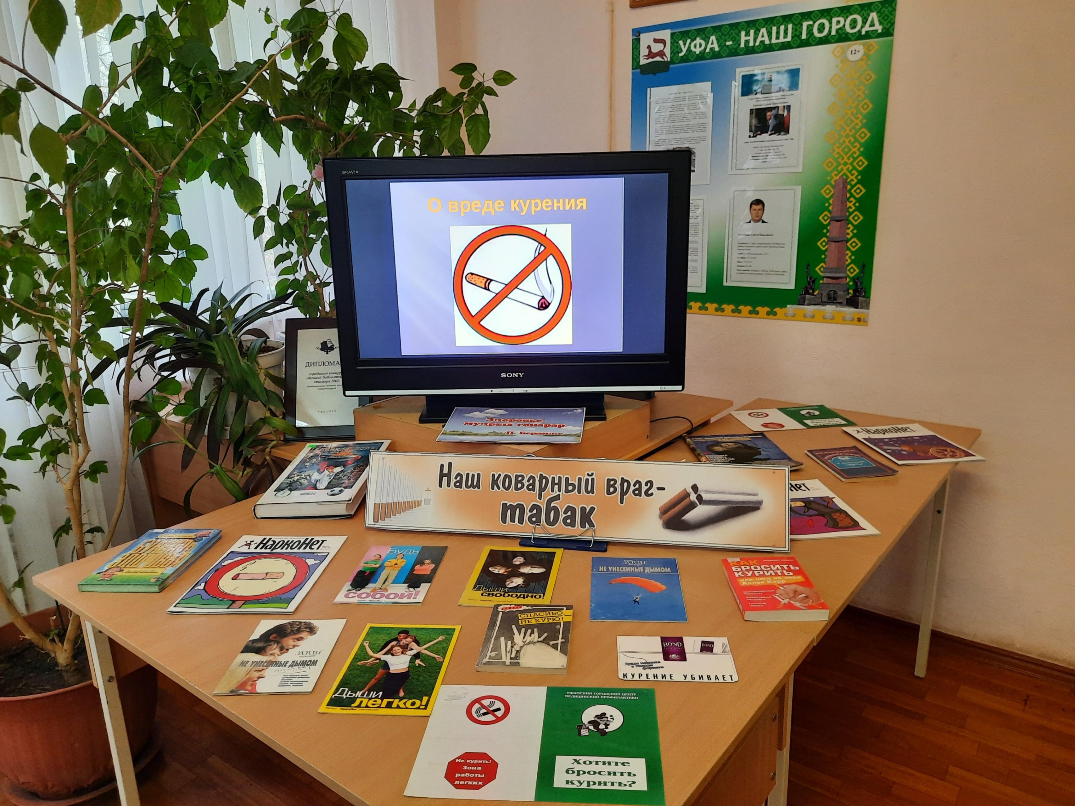 К мероприятию библиотека подготовит книжную выставку «Спасибо, не курю». На выставке будут представлены книги, журналы и статьи из периодических изданий, цитаты знаменитых людей о вреде курения и способах отказа от вредной привычки.