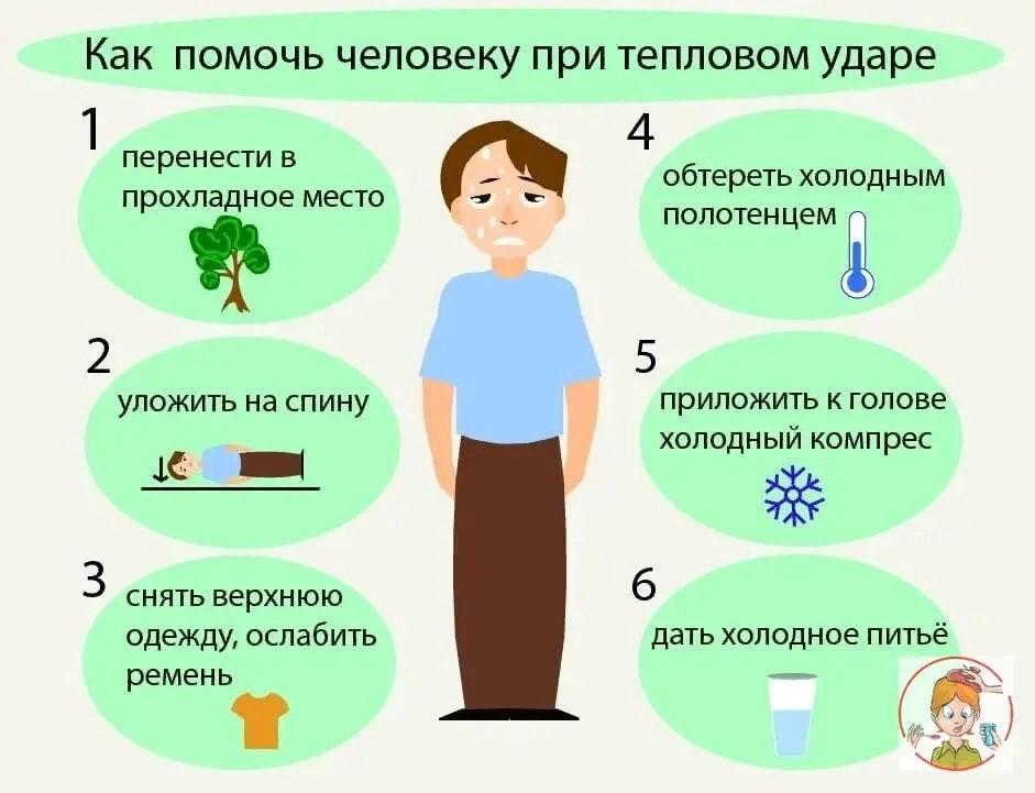 1.Немедленно поместите пострадавшего в тень или перенесите его в прохладное помещение 2.Снимите одежду с верхней половины тела и уложите на спину, немного приподняв голову 3.Положите на голову холодный компресс .4.Оберните тело мокрой простыней или опрыскайте прохладной водой .5 .Дайте пострадавшему обильное питье .6.При обморочном состоянии поднесите к носу вату, смоченную нашатырным спиртом . 7.При необходимости, вызовите врача . И многое другое расскажет вам заведующая сельским клубом .Всех желающих приглашаем на полезную беседу.