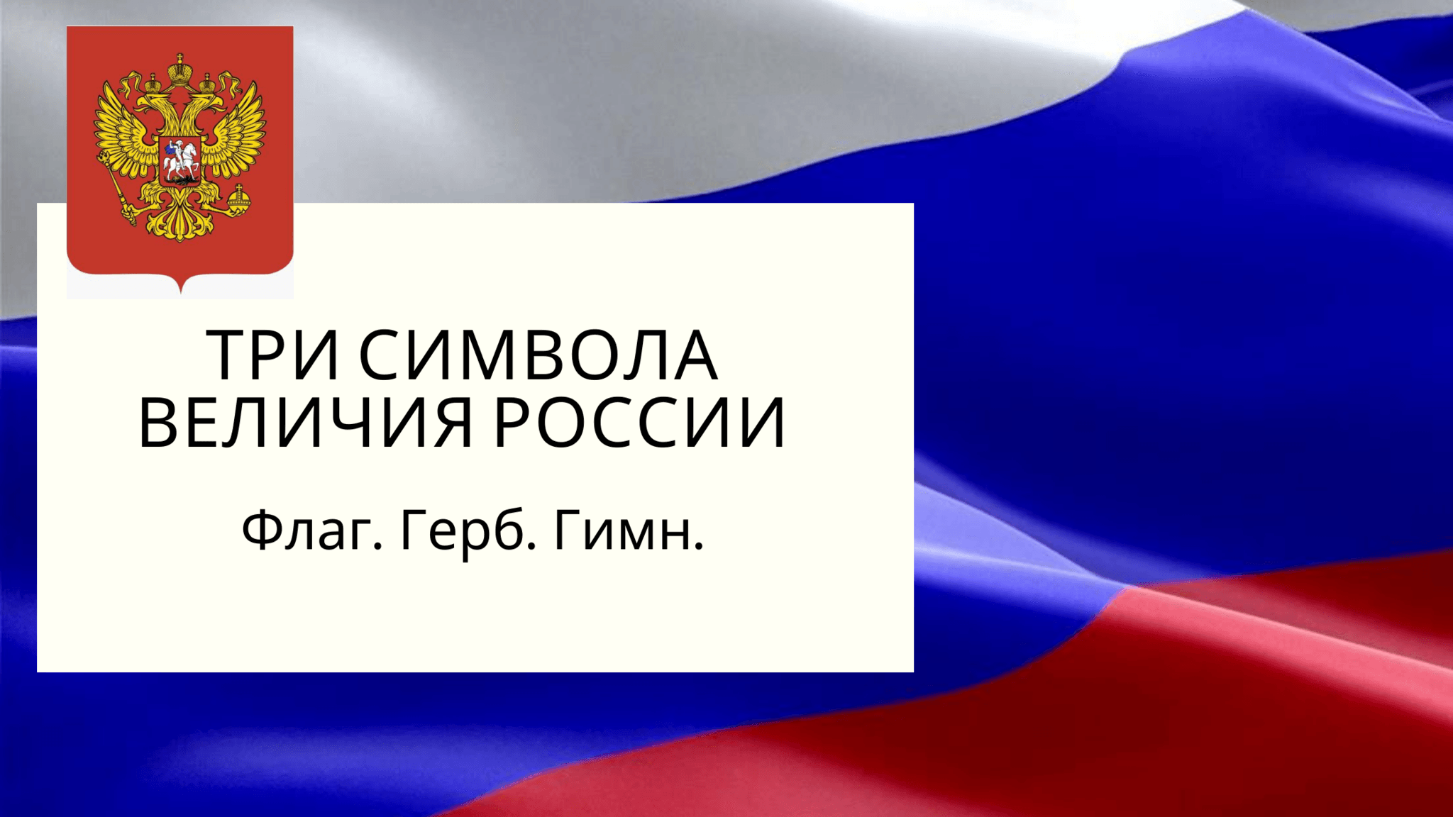В познавательной программе «Три символа величия России» читатели познакомятся с символикой Российского государства: флагом, гербом, гимном. Ребята узнают, что означает демократическое федеративное правовое государство, как произошло слово Родина и что оно означает. Узнают об истории российского флага и герба, что символизирует цвета триколора, в каком году установлен праздник — День государственного флага РФ, прослушают в записи исполнение гимна страны, ответят на вопросы викторины.