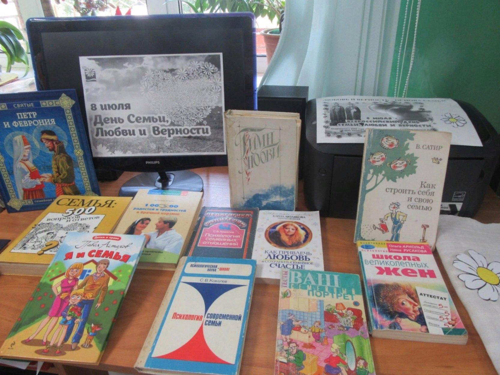 8 июля — День семьи, любви и верности. Символом праздника считается открытка с изображением ромашки. В преддверии Дня семьи, любви и верности в библиотеке будет оформлена книжная выставка, на которой центральное место займет книга о святых Петре и Февронии Муромских. Также будут представлены художественные произведения, книги о воспитании и семье, детская литература, справочные и энциклопедические материалы. Наряду с книгами о семье и семейных ценностях на выставке будут представлены цитаты известных людей о роли семьи.