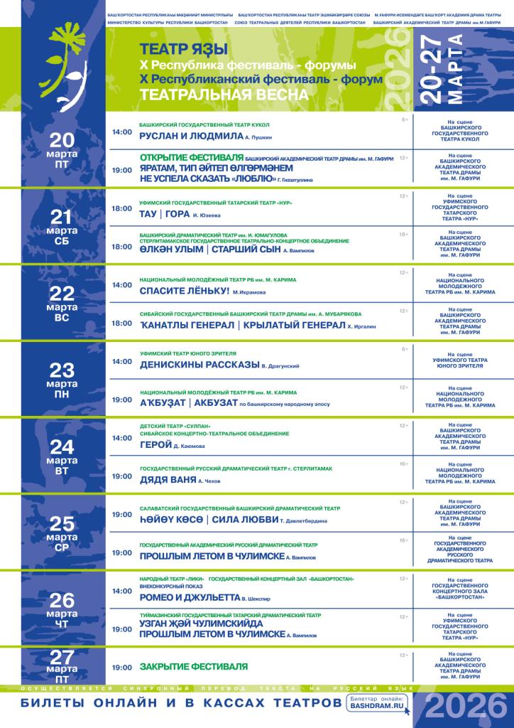 Официальный старт «Театральной весне» будет дан 20 марта на сцене Башкирского академического театра драмы имени Мажита Гафури. Торжественная церемония открытия в фойе театра предшествует основному вечернему событию — показу спектакля «Не успела сказать люблю» в постановке Айрата Абушахманова. Дневная программа первого фестивального дня порадует юных зрителей: Башкирский государственный театр кукол приглашает на спектакль «Руслан и Людмила» по знаменитой поэме Александра Пушкина.