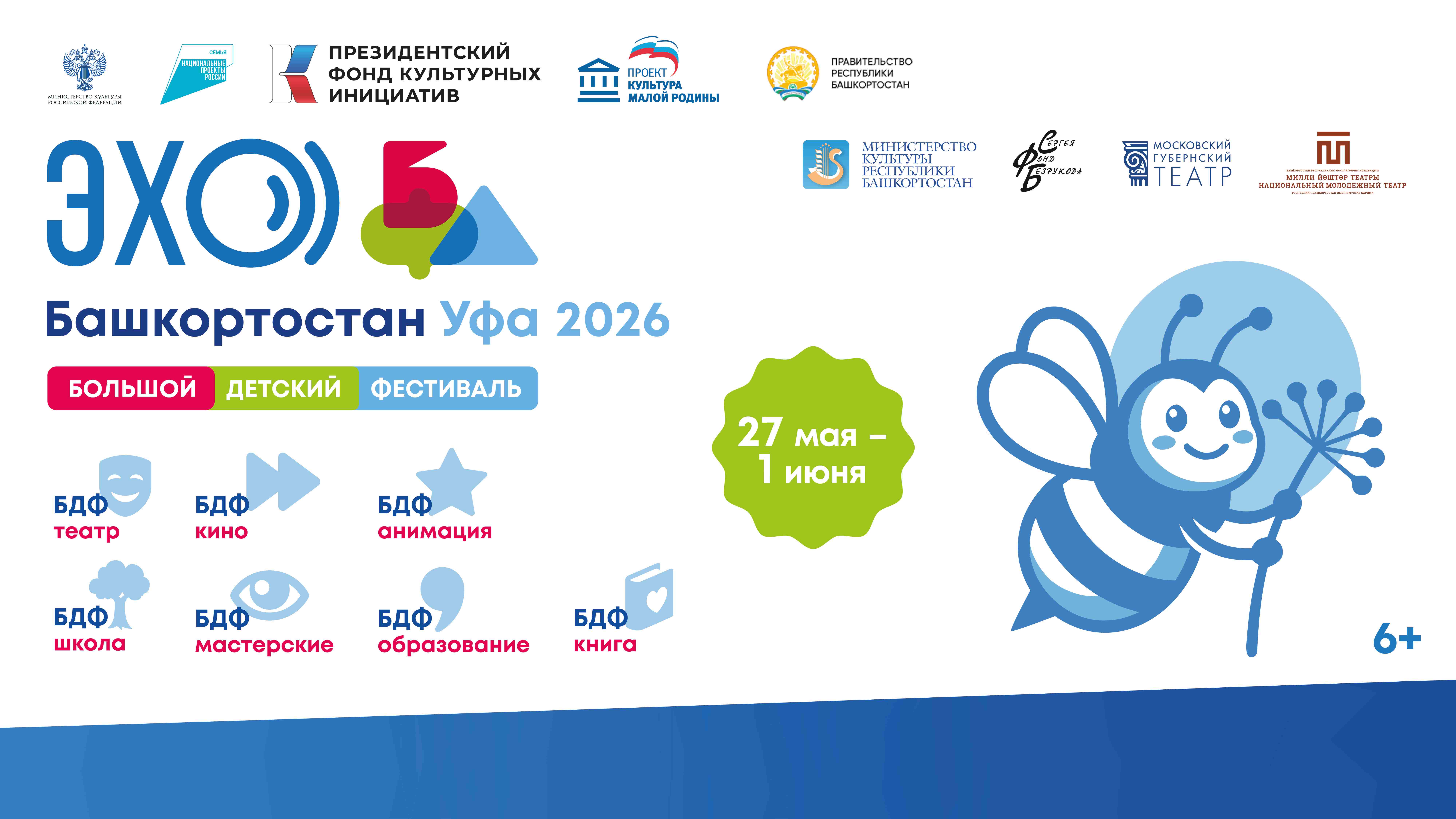 С 27 мая по 1 июня 2026 года в Республике Башкортостан состоится специальная программа Большого Детского фестиваля под руководством народного артиста Российской Федерации Сергея Безрукова — «ЭХО БДФ Республика Башкортостан».