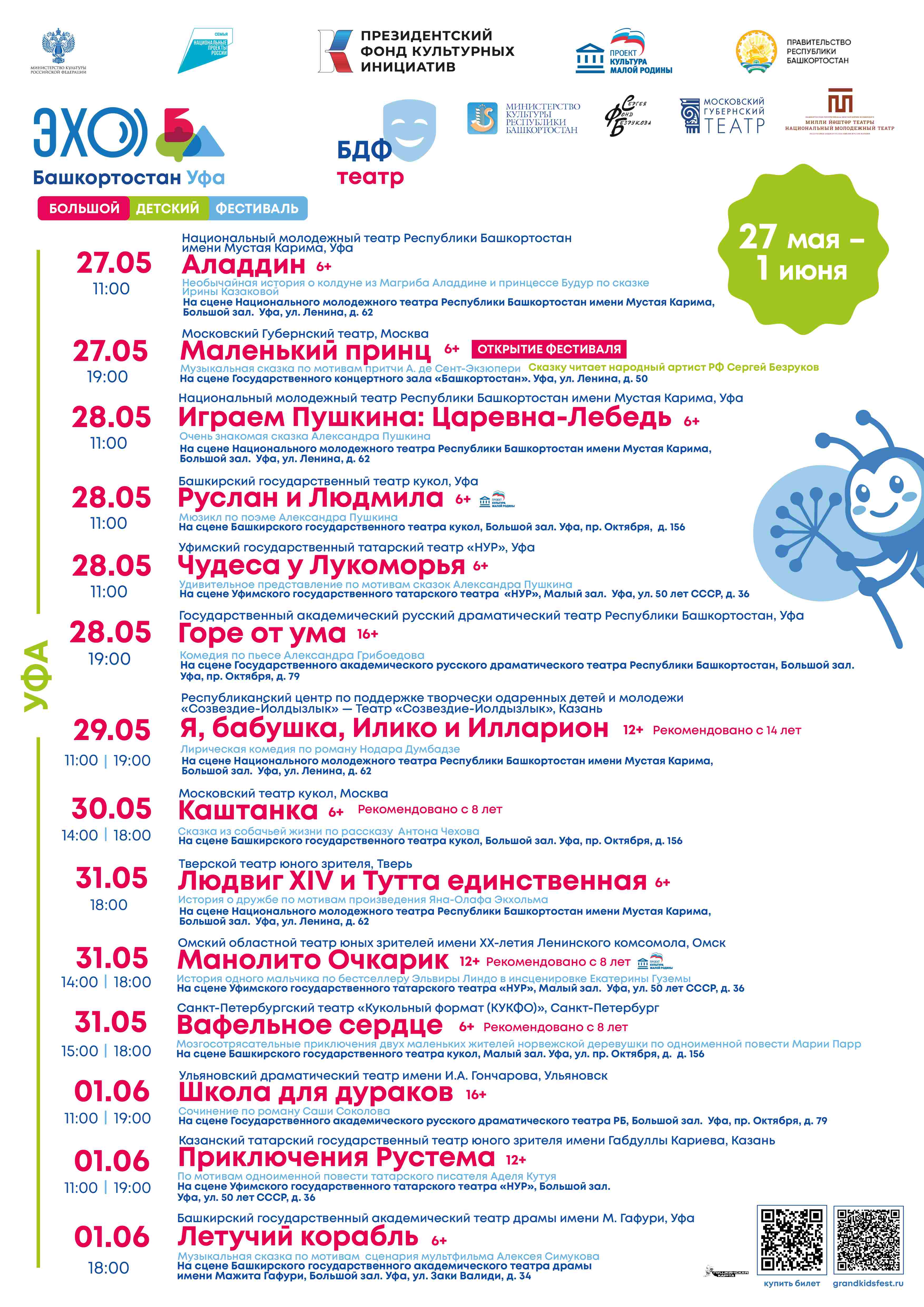 В фестивальную афишу также вошли яркие постановки от лауреатов Большого Детского Фестиваля (БДФ) и ведущих театров Башкортостана.