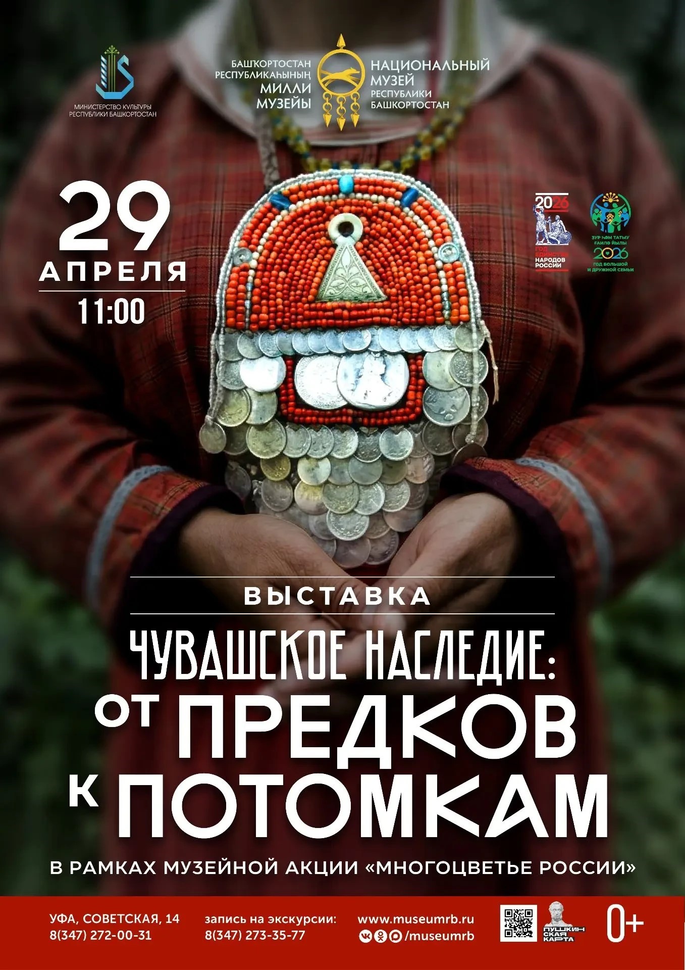 Выставка проходит в рамках Года единства народов России и Года большой и дружной семьи в Республике Башкортостан, и продолжает музейную акцию «Многоцветье России», которая становится еще одной яркой главой в серии этнографических проектов Национального музея Башкортостана.