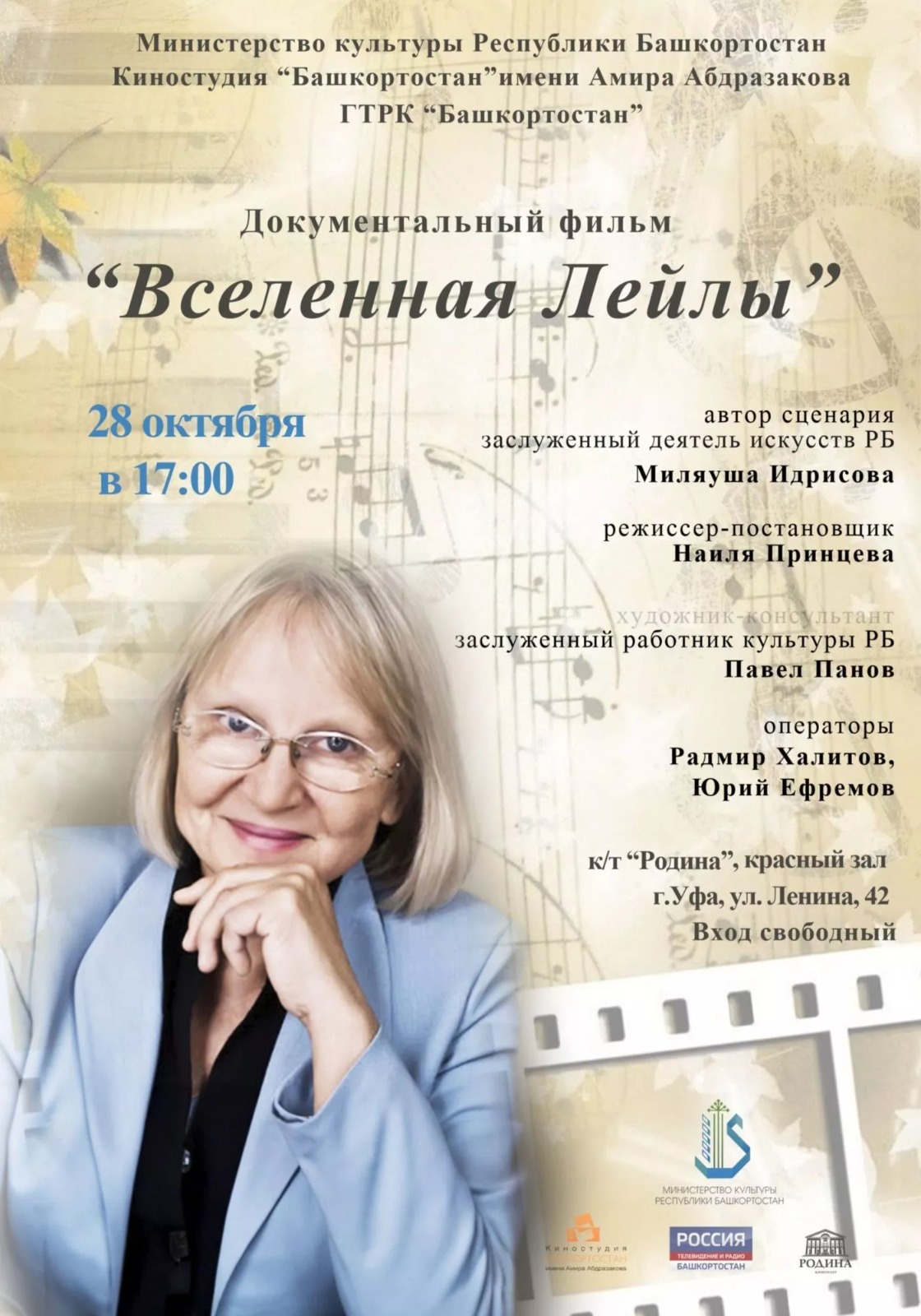 28 октября в кинотеатре «Родина» пройдёт премьерный показ документального фильма «Вселенная Лейлы», посвященного жизни и творчеству композитора, пианистки и педагога Лейлы Исмагиловой.