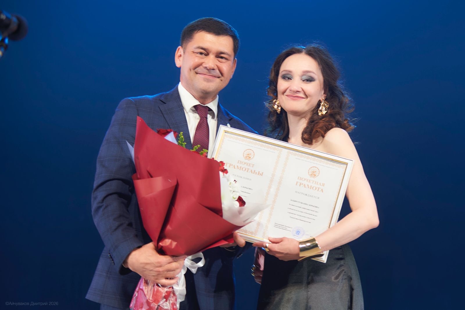 Тамара Тансыккужина вручила юбиляру Почетную грамоту Государственного Собрания — Курултая РБ. Начальник Управления по культуре и искусству Администрации города Уфы Айгуль Хасанова поздравила артистку от имени мэрии.