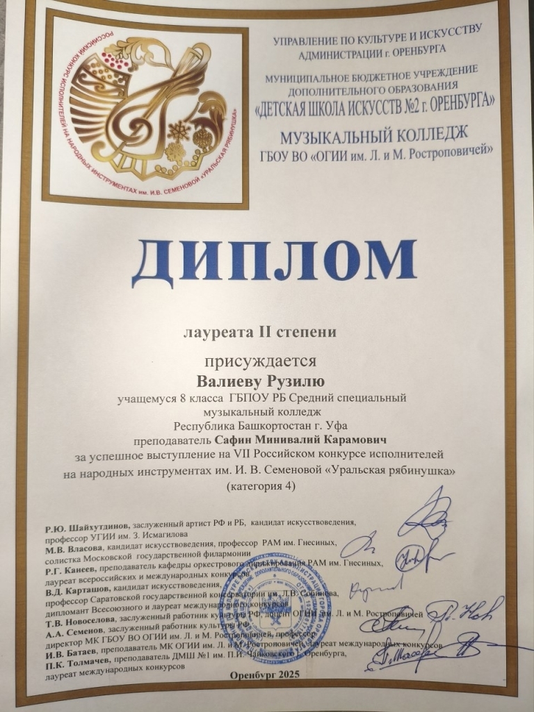 Еще один ученик преподавателя Минивалия Сафина Валиев Рузиль стал лауреатом II степени, что также является значительным достижением.