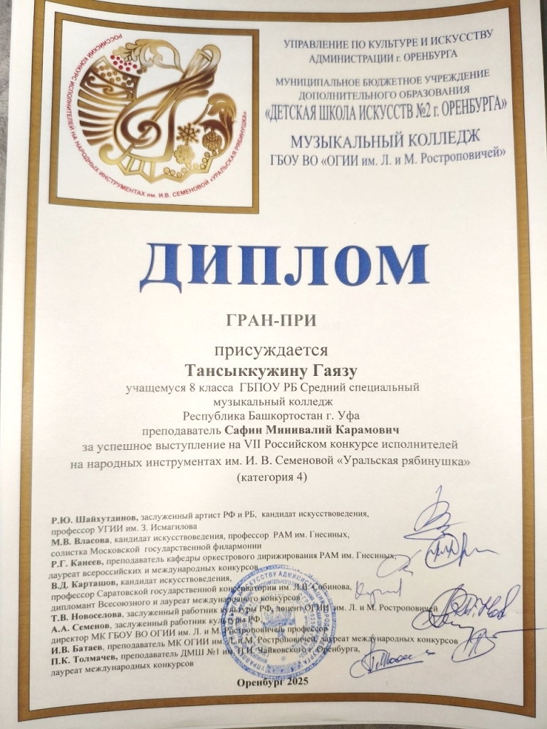 По итогам конкурсных состязаний, Гран-При было присуждено сразу трем талантливым исполнителям, одним из которых является учащийся ССМК Гаяз Тансыккужин (класс преподавателя Минивалия Сафина). Высшую награду также получили студентка Российской академии музыки имени Гнесиных Анна Моринова и учащийся Музыкальной школы РАМ имени Гнесиных Григорий Тюлеманов. Особо стоит отметить выдающееся выступление Гаяза Тансыккужина, продемонстрировавшего виртуозное владение баяном и покорившего сердца зрителей и жюри.