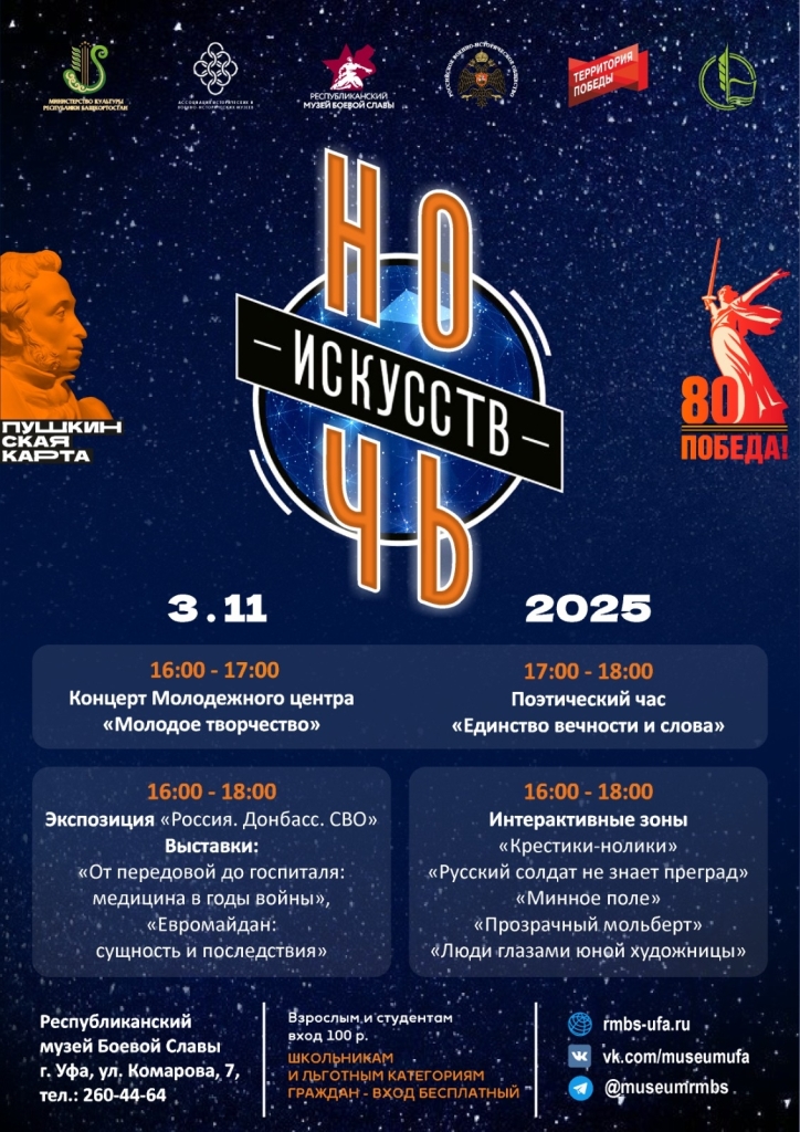 В Республиканском музее Боевой Славы состоятся поэтический час «Единство вечности и слова» и концерт Молодежного центра «Молодое творчество». Ночь искусств также позволит ознакомиться с новой экспозицией «Россия. Донбасс. СВО», выставками «От передовой до госпиталя: медицина в годы войны», «Евромайдан: сущность и последствия» и интерактивными зонами «Крестики-нолики», «Российский солдат не знает преград», «Минное поле», «Прозрачный мольберт», «Люди глазами юной художницы».