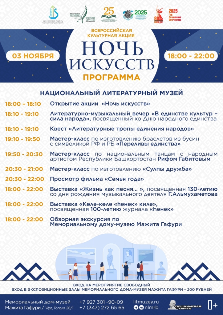 В эту ночь центральные мероприятия Национального литературного музея РБ пройдут в Мемориальном доме-музее имени Мажита Гафури. В программе – литературно-музыкальный вечер «В единстве культур – сила народа», квест «Литературные тропы единения народов», мастер-классы по национальным танцам, созданию монисто и браслетов с символикой России и Башкортостана, показ фильма «Семья года» режиссёра Айнура Аскарова. Гости дома-музея также могут ознакомиться с выставкой «Жизнь как песня...» о жизни и творчестве народного артиста БАССР Газиза Альмухаметова и экспозицией «Көлә-көлә һәнәк килә», посвященной столетию журнала «Һәнәк».